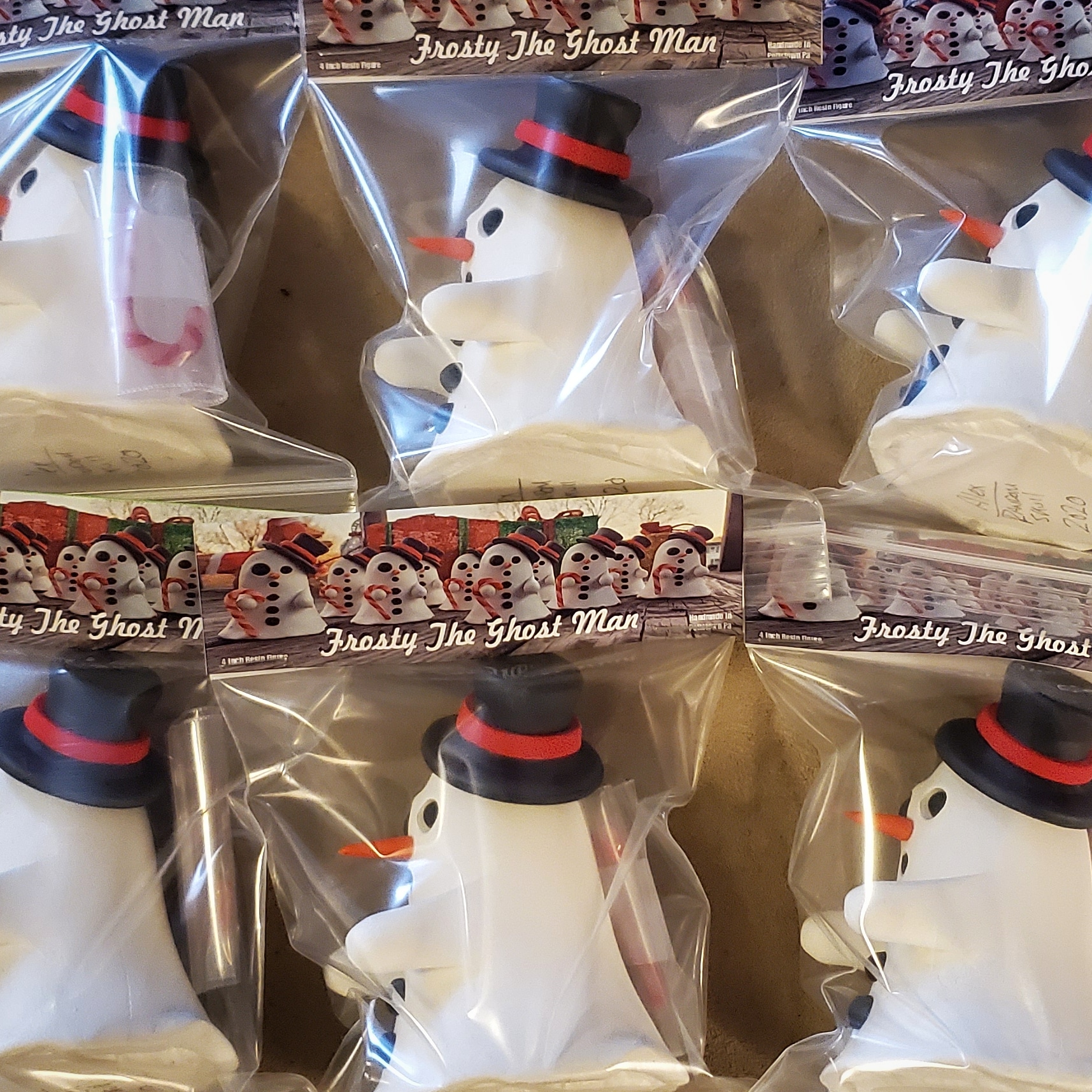Frosty The Ghost Man stands just over 4 inches tall, maybe alittle taller with the hat and will come bagged with a header card Frosty the Ghost Man is excited to come spend the holiday season with you and your family!